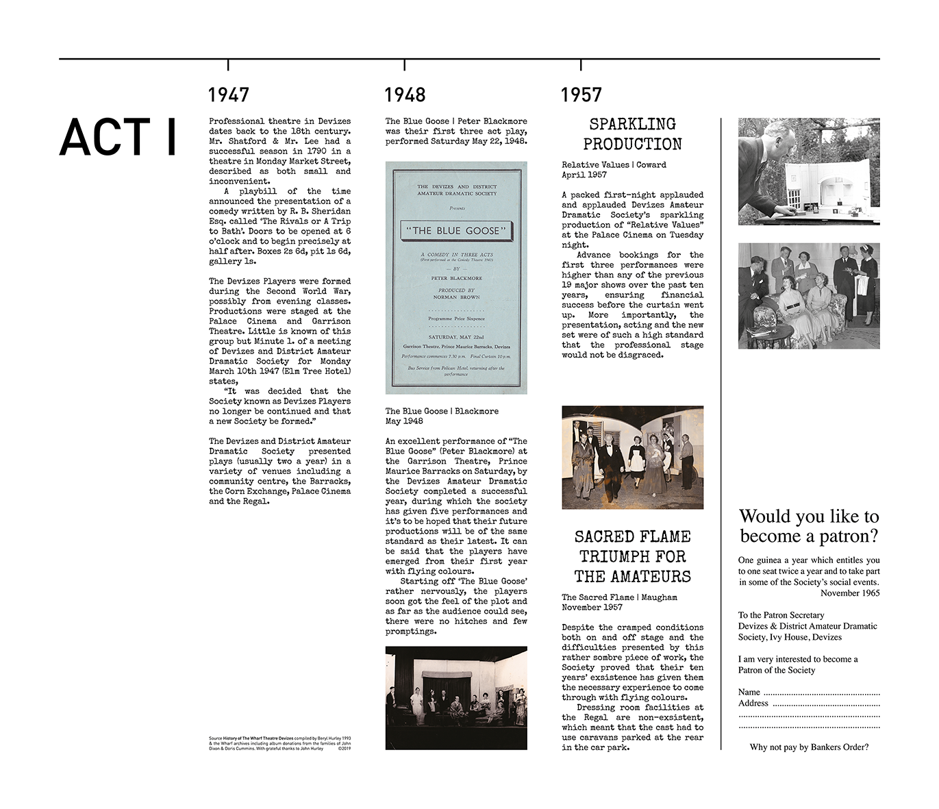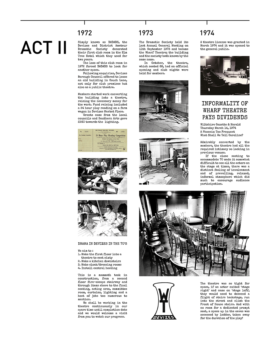 Once an impressive waterside warehouse standing on the banks of the Kennet and Avon Canal, the Wharf became a 96 seat theatre in 1979. The Devizes and District Amateur Dramatic Society, formed in 1947, made it their home and The Wharf Theatre, as we know it today, was born. It remains the only dedicated theatre in East Wiltshire.